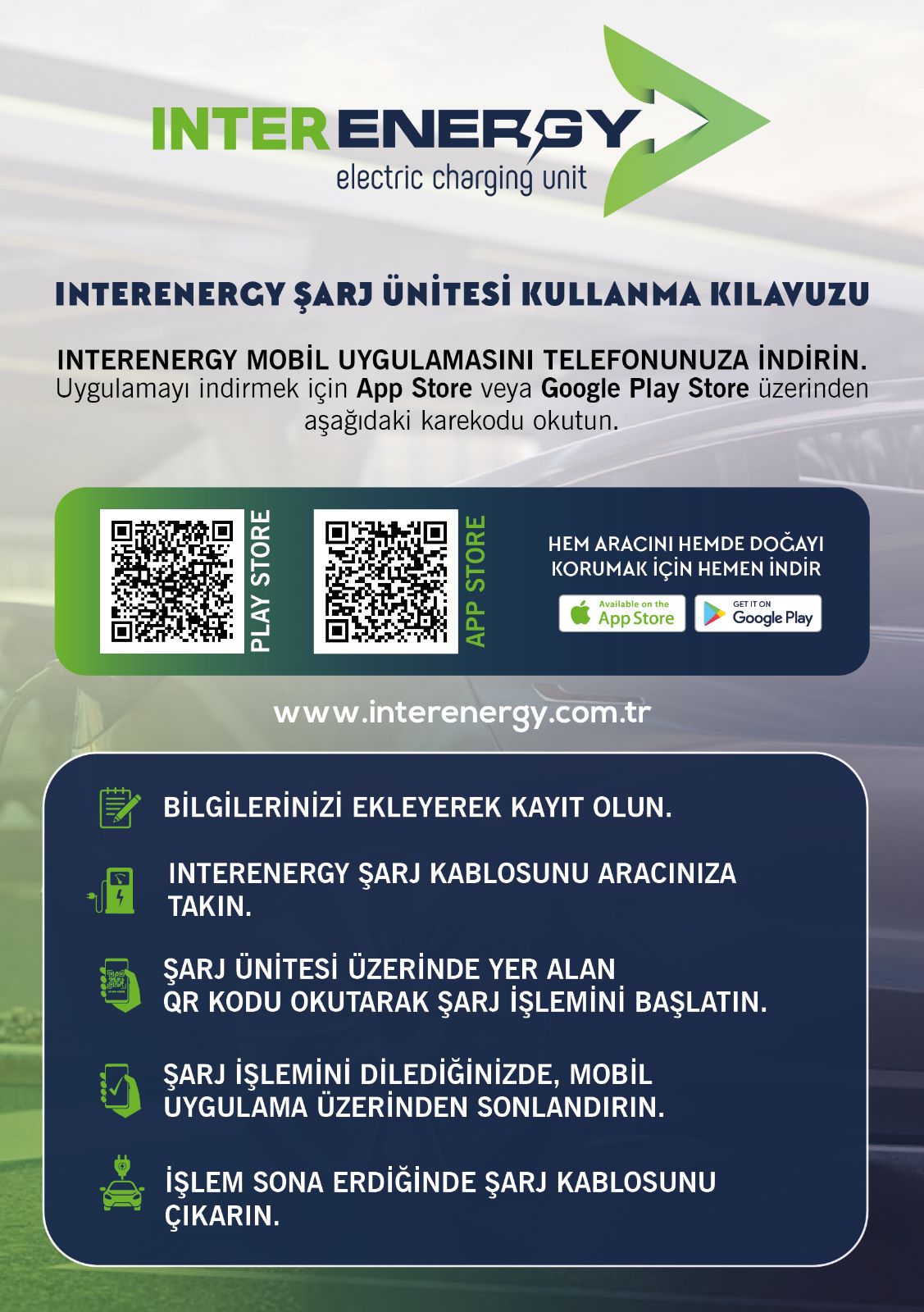 Şarj hizmeti desteği ve INTERENERGY hesap yardımı için 7 gün 24 saat ilgileniyoruz.